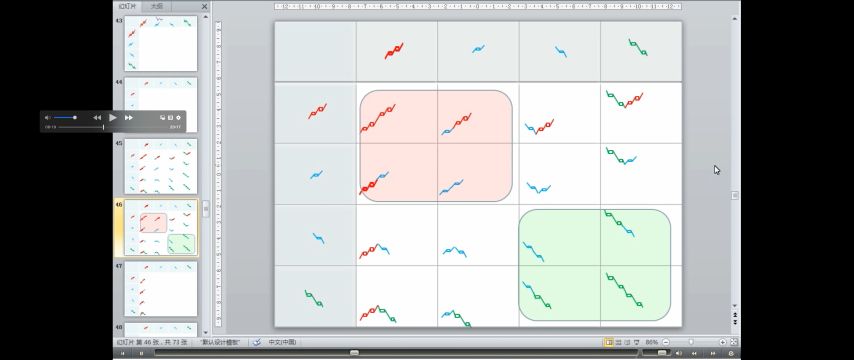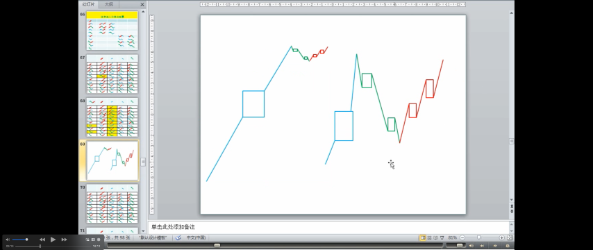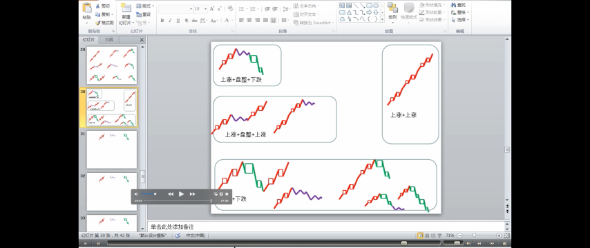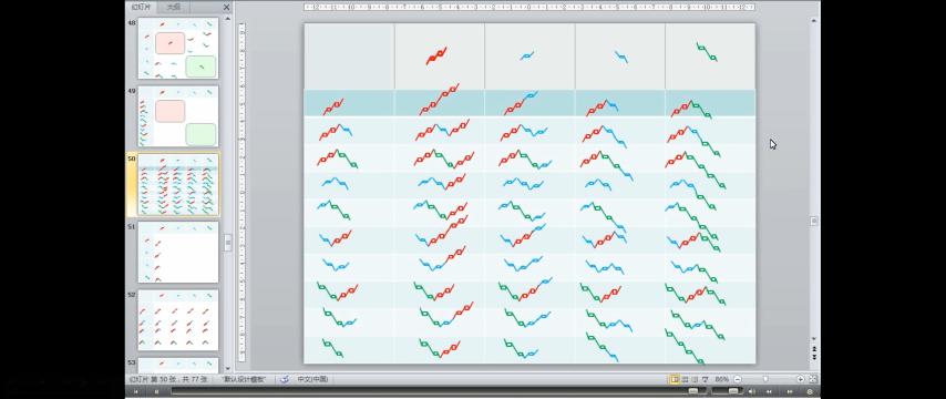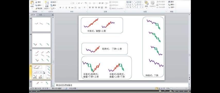 - 中继式:上涨+盘整+上涨;下跌+盘整+下跌。