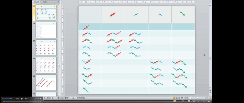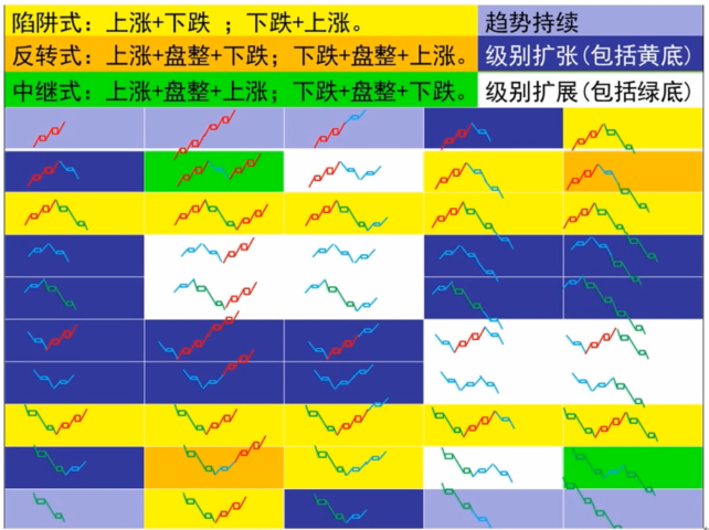 上涨、下跌、盘整三种基本走势,有六种组合可能代表着三类不同的走势: