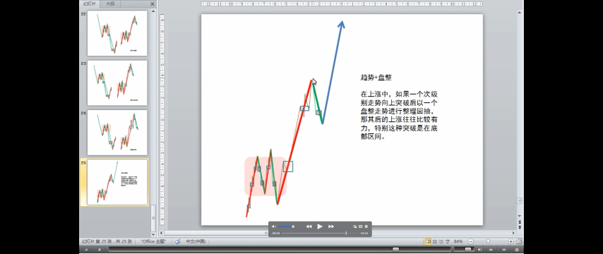 这定理三中的两个次级别走势的组合只有三种: 趋势+盘整,趋势+反趋势,盘整+反趋势。其中的趋势分为上涨与下跌,分别代表从上方突破与下方跌破两种情况。而站在实用的角度,最用力的破坏,就是: 趋势+盘整。例如在上涨中,如果一个次级别走势向上突破后以一个盘整走势进行整理回抽,那其后的上涨往往比较有力,特别这种突破是在底部区间。这种情况太常见了,其理论依据就在这里。