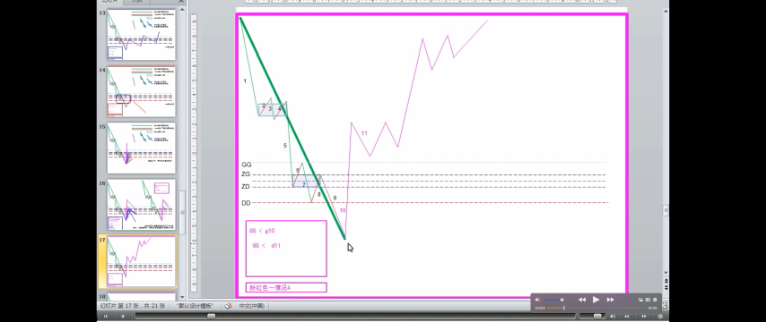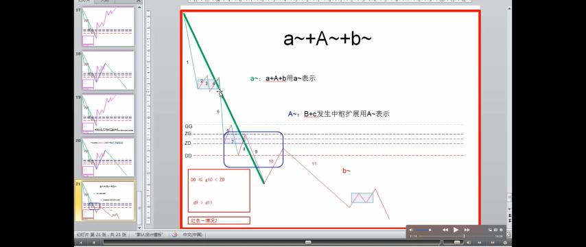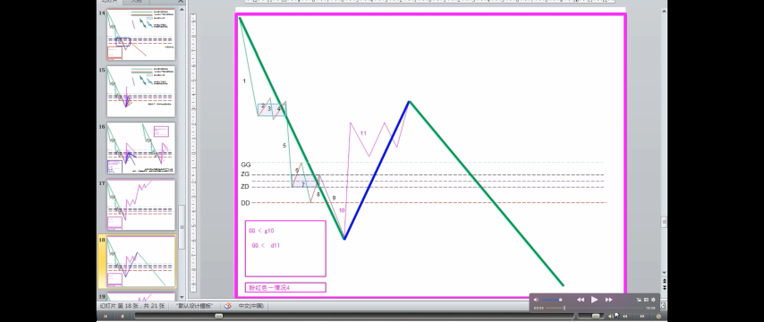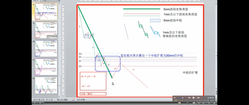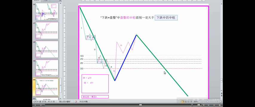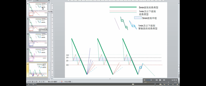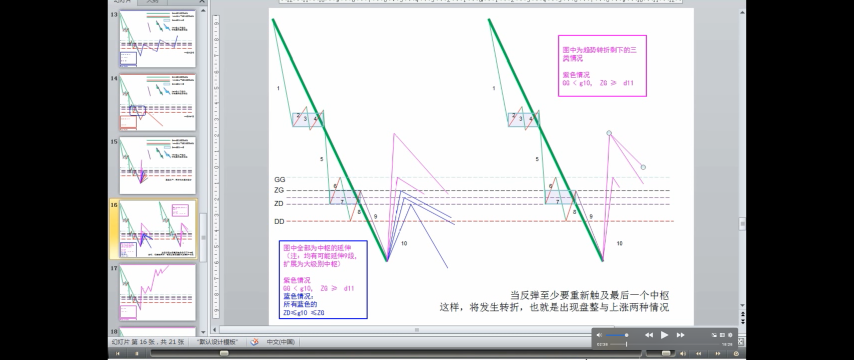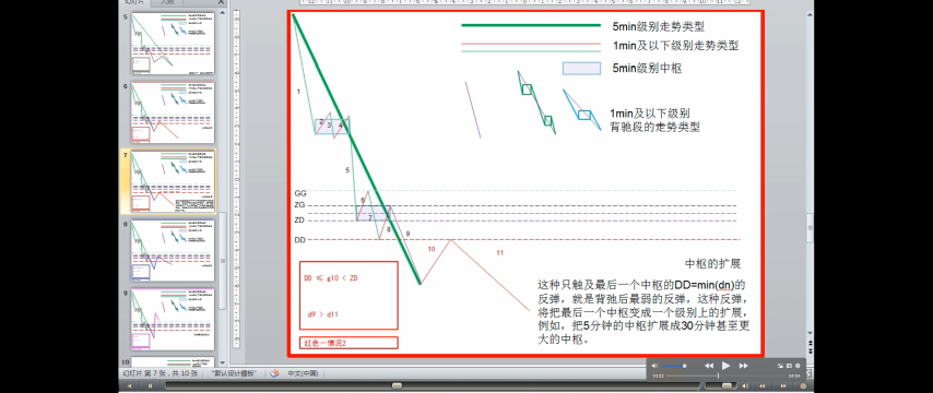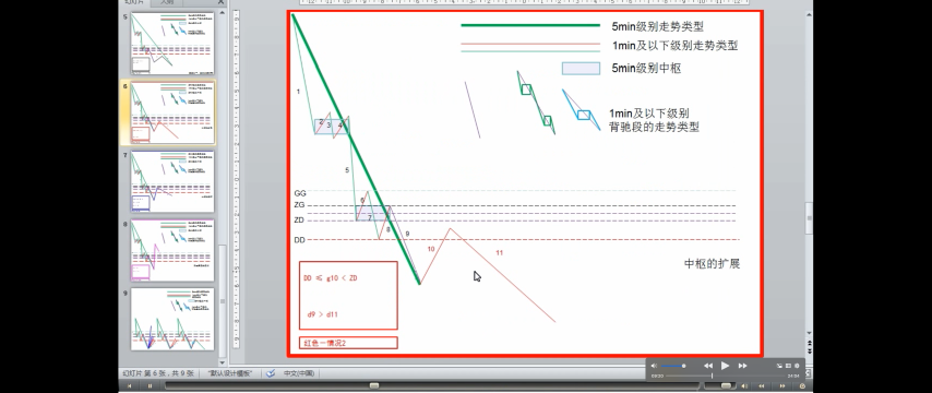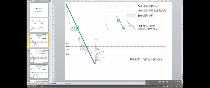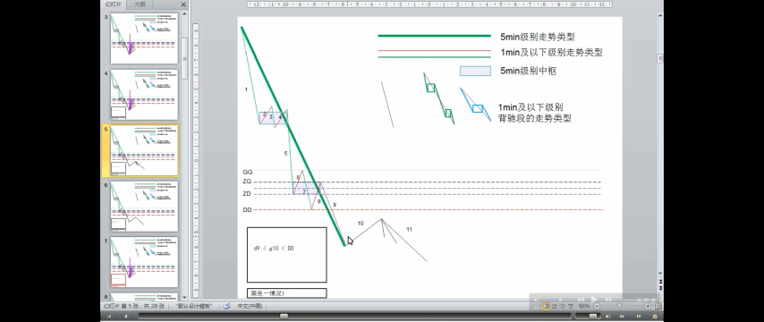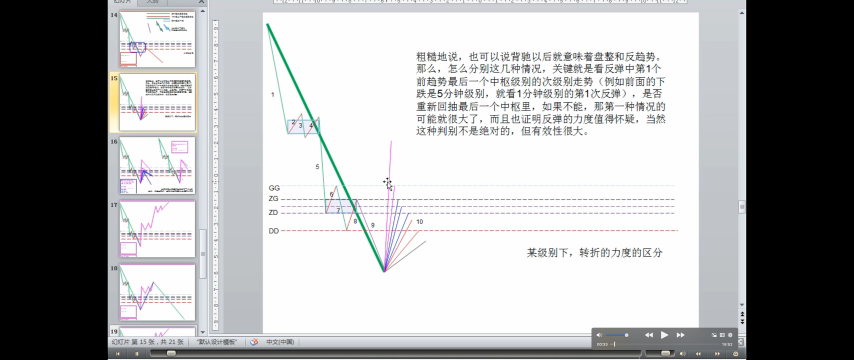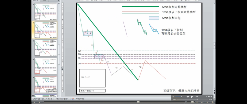 - DD<=第一次次级别走势<ZD,走势力度弱,趋势的最后一个中枢升级可能性很大,当然这种判别不是绝对的,但有效性很大。