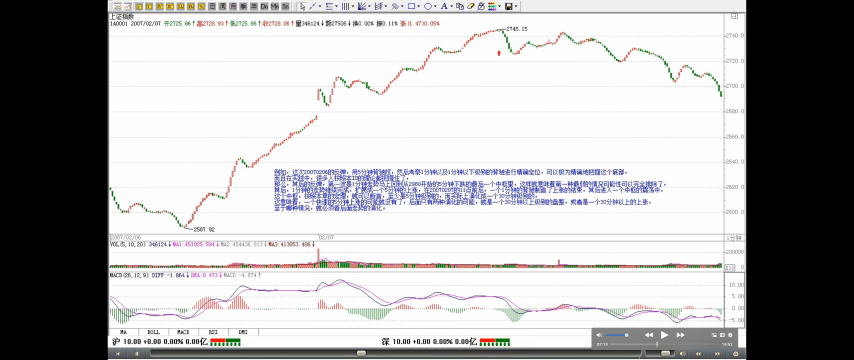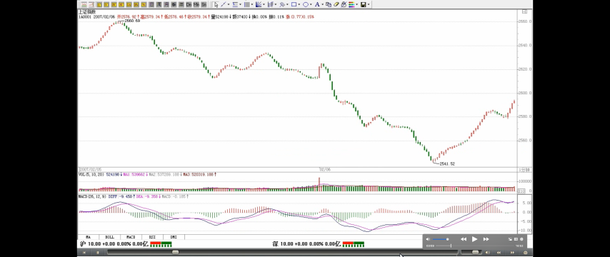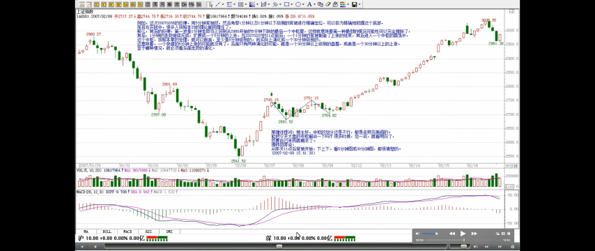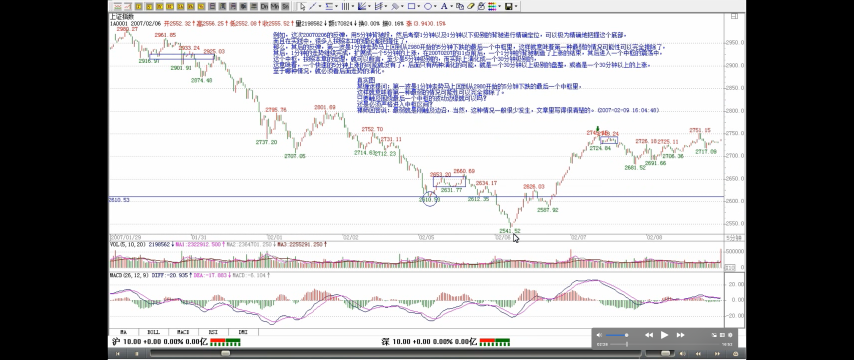 例如,这次 20070206 的反弹,用 5 分钟背驰段,然后考察 1 分钟以及 1 分钟以下级别的背驰进行精确定位,可以极为精确地把握这个底部,而且在实践中,很多人按照本 ID 的理论都把握住了,那么,其后的反弹,第一波是 1 分钟走势马上回到从 2980 开始的 5 分钟下跌的最后一个中枢里(疑问🤔️:看图没回到啊,DD< g <ZD),这样就意味着第一种最弱的情况可能性可以完全排除了,其后,1 分钟的走势继续完成,扩展成一个 5 分钟的上涨,在 20070207 的 11 点前后,一个 1 分钟的背驰制造了上涨的结束,其后进入一个中枢的震荡中,这个中枢,按照本章的定理,就可以断言,至少是 5 分钟级别的,而实际上演化成一个 30 分钟级别的,这意味着,一个快速的 5 分钟上涨的可能就没有了,后面只有两种演化的可能,就是一个 30 分钟以上级别的盘整,或者是一个 30 分钟以上的上涨,至于哪种情况,就必须看后面走势的演化。