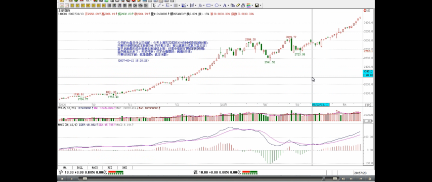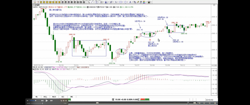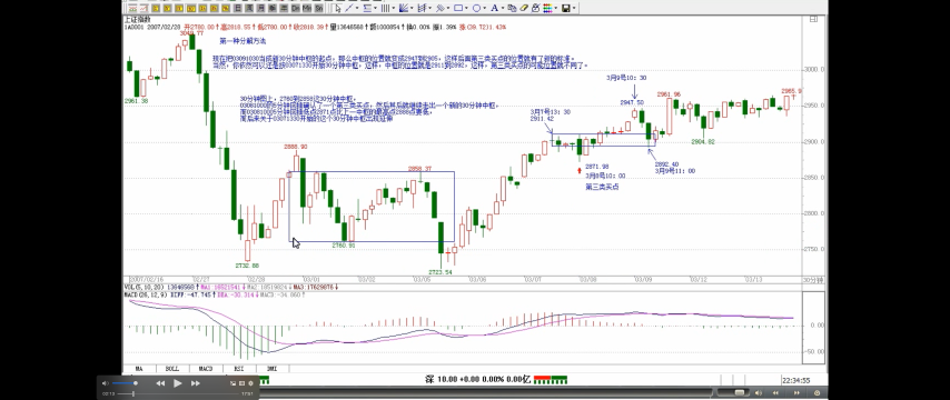注意,这种重新组合,不涉及任何预测性,有人可能要问,那么为什么不一开始就把 03081000 的 5 分钟回抽组合到 03051330 开始的这段 5 分钟走势中?因为这种组合不利于操作,站在这种组合下,030810005 分钟回抽的第三类买点意义并没有被揭示,是仅仅被局限在一个小的 5 分钟走势范围内,按照这种组合,就会很恐慌地等待背驰,之所以这样,是因为对走势的理解不够深刻,看不到不同组合反映的意义。而任何组合的反映都是有意义的,对这些组合意义的全面把握,就是一个工夫上的长进了。此外,组合的一个要点在于,尽量避繁就简,因为中枢扩展比较复杂,如果有组合使得不出现扩展,当然就采取该种组合更有意义。有人可能要问,那么中枢扩展的定义是否不适用?当然适用,中枢扩展的定义是在两个中枢都完全走出来的情况下定义的,而实际操作中,往往第二个中枢还没有走完,还在继续延伸中,所以,除非出现明确的、符合理论定义的破坏,就可以根据有利于判断、操作的原则,对走势进行当下的组合。但必须强调的是,当下采取什么组合,就要按该种组合的具体图形意义来判断、操作,例如,现在把 03091030 当成新 30 分钟中枢的起点,那么中枢的位置就变成 2947 到 2905,这样后面第三类买点的位置就有了新的标准。当然,你依然可以还是按 03071330 开始 30 分钟中枢,这样,中枢的位置就是 2911 到 2892,这样,第三类买点的可能位置就不同了。