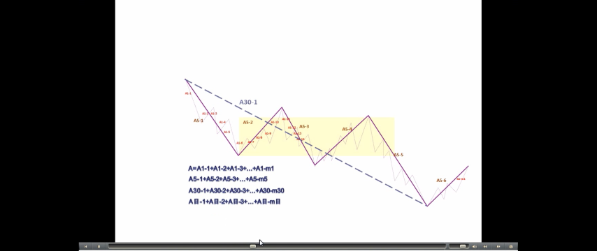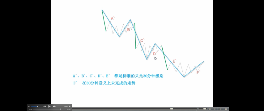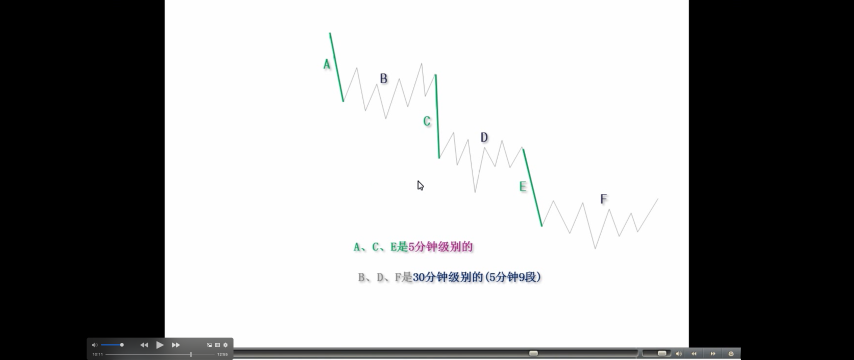 一个最简单的释义角度,就是级别,任何一段走势,都可以根据不同的级别进行分解,不妨用 An-m 的形式表示根据 n 级别对 A 段进行分解的第 m 段,就有, A=A1-1+A1-2+A1-3+…+A1-m1=A5-1+A5-2+A5-3+…+A5-m5=A30-1+A30-2+A30-3+…+A30-m30= A 日-1+A 日-2+A 日-3+…+A 日-m 日等等,显然这些分解都符合本 ID 理论。而根据某级别进行操作,站在纯理论的角度,无非等价于选择该等式列中某个子式子进行操作,这在上一课中已经有具体说明。