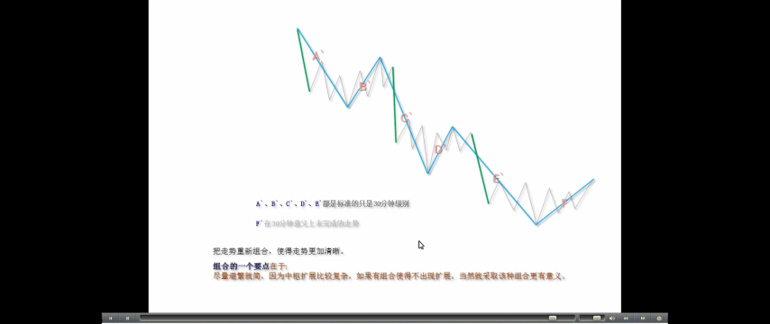 还有一种应用,就是把走势重新组合,使得走势更加清晰。很多人一看走势就晕,最主要是不了解走势连接的结合性,任何的走势,在结合律上,都可以重新组合,使得走势显示明显的规律性。假设 A+B+C+D+E+F,A、C、E 是 5 分钟级别的,B、D、F 是 30 分钟级别的,其中还有延伸等复杂情况。这时候,就可以把这些走势按 5 分钟级别重新分解,然后按中枢的定义重新组合走势,按结合律的方法,把原来的分解变成 A`+B`+C`+D`+E`+F`,使得 A`、B`、C`、D`、E`都是标准的只是 30 分钟级别,而最后的 F`变成在 30 分钟意义上未完成的走势,这样进行分析,就会很明晰了。当然,具体的组合有很多可能,如何根据当下的走势选择一种最有利指导操作的,就是考功夫的事情。