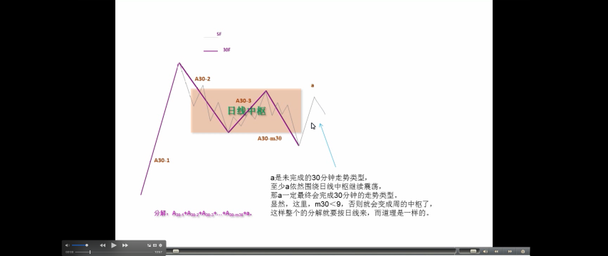 还有一种更重要的应用,就是在中枢的震荡中。围绕中枢的震荡,不一定都是次级别的,例如,一个日线中枢,围绕他的震荡,完全可以是 30 分钟以下的任意级别,甚至是一个跳空缺口,例如有些股票,完全可以今天一字涨停,明天一字跌停,跳来跳去的。一般这种走势,一般人看着就晕了。但如果明白走势连接的结合性,就知道,无论怎么跳,最终都要形成更大级别的,只要不脱离这日线中枢,最后都至少会形成 30 分钟级别的走势。任何围绕日线级别的震荡,最终都必然可以按如下方式进行分解:A30-1+A30-2+A30-3+…+A30-m30+a,a 是未完成的 30 分钟走势类型,至少 a 依然围绕日线中枢继续震荡,那 a 一定最终会完成 30 分钟的走势类型。显然,这里,m30<9,否则就会变成周的中枢了,这样整个的分解就要按日线来,而道理是一样的。