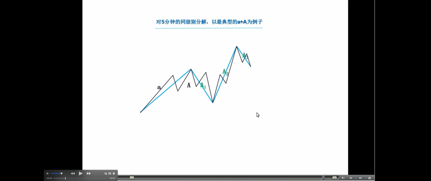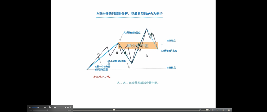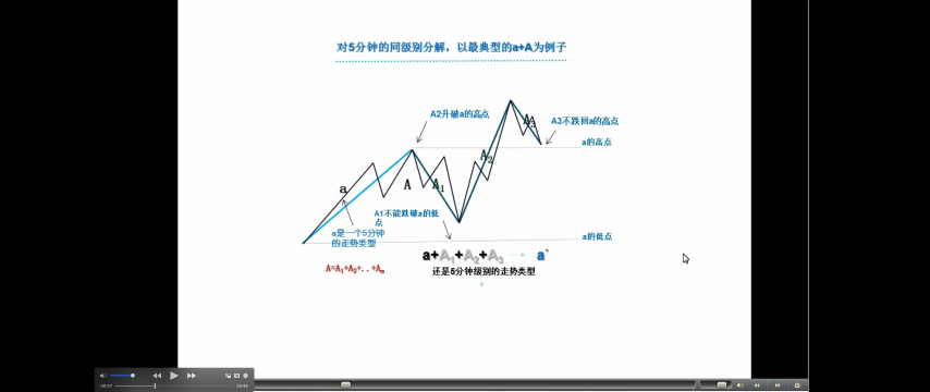 按同级别分解操作,还可能有更广泛、更精确的操作。对 5 分钟的同级别分解,以最典型的 a+A 为例子,一般情况下,a 并不一定就是 5 分钟级别的走势类型,但通过结合运算,总能使得 a+A 中,a 是一个 5 分钟的走势类型,而 A,也分解为 m 段 5 分钟走势类型,则 A=A1+A2+..+Am。想考虑 a+A 是向上的情况,显然,Ai 当 I 为奇数时是向下的,为偶数时是向上的,开始先有 A1、A2 出现,而且 A1 不能跌破 a 的低点,如果 A2 升破 a 的高点而 A3 不跌回 a 的高点,这样可以把 a+ A1+A2+A3 当成一个 a`,还是 5 分钟级别的走势类型(疑问🤔️: a+A1+A2 这三个 5 分钟的走势类型重叠,为什么还是 5 分钟走势类型?看 A1+A2+A3,没有重叠!又为什么不把 a 算在内?a 算是中枢进入段?)。因此,这里可以一般性地考虑 A3 跌破 a 的高点情况,这样,A1、A2、A3 必然构成 30 分钟中枢。因此,这一般性的 a+A 情况,都必然归结为 a 是 5 分钟走势类型,A 包含一 30 分钟中枢的情况。
