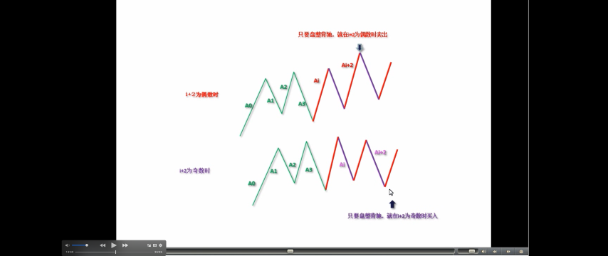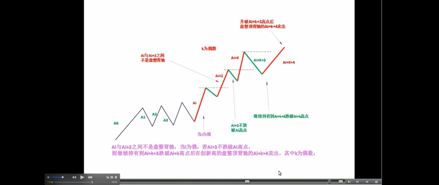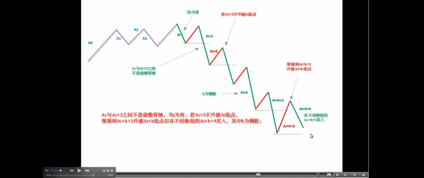 看完上面这段,至少 90%以上的人都心跳加速,头晕眼花。不过没办法,这是最精确的表述,画着图应该不难明白。以上的方法,最大的特点是,就是在同级别分解的基础上将图形基本分为两类,一类是“当 i 为偶 Ai+3 不跌破 Ai 高点”或“i 为奇数 Ai+3 不升破 Ai 低点”;一类是“Ai 与 Ai+2 之间盘整背驰”。对这两种情况采取不同的操作策略,构成了一种机械的操作方法。