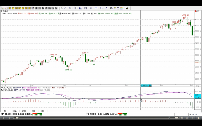 有人可能要问,第一种情况中如果是 5 分钟级别的回跌,也会形成一个比 1 分钟级别大的中枢,那和第二种情况有什么区别?这区别太大了,在第一种情况中,其回跌是必然的,而第二种情况,在形成一个比 1 分钟大的中枢后,并不必然回跌,可以往上突破,使得 a+A+b+B+c 继续延伸。这种小级别背驰最终转化成大级别转折的情况,最值得注意的,是出现在趋势走势的冲顶或赶底之中,这种情况一般都会引发大级别的转折,这种例子前面都说过,例如 20070104 的工行,20061207 的北辰实业、20070122 的水井坊等。