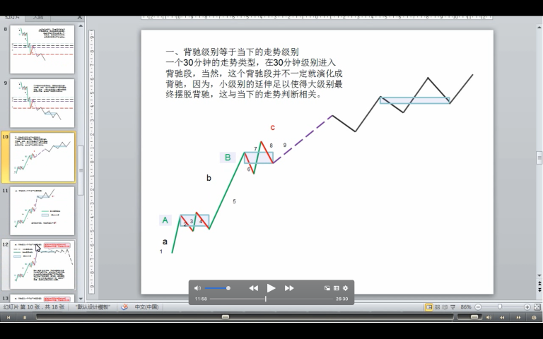 有了以上的例子,就对如何用背驰对走势分解的基本原则有一个大概的了解了,熟悉了这些分解方法,市场的走势图就不会是天书了,而是如自己的掌纹一样清晰可辩。