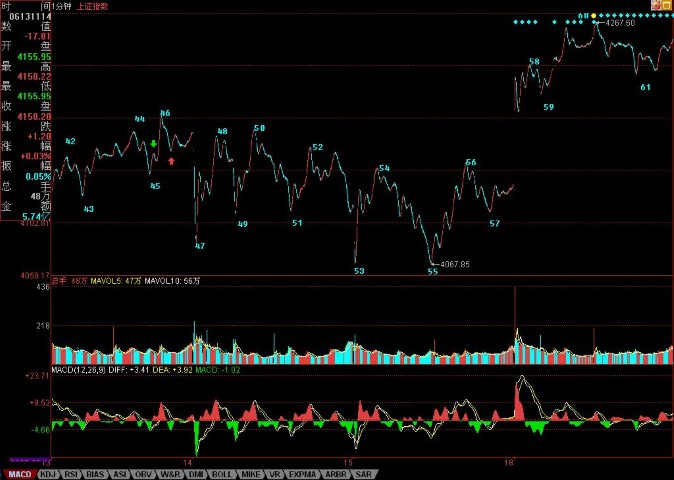 今天的走势昨天已经说得很清楚,4224 点下不出现第三类卖点,就是强势震荡。今天的走势,显然符合这个要求。4224 点,就是上图 61 这位置,从 60 开始的 1 分钟中枢[4224,4254],今后两天就看这中枢的第三类买卖点。换言之,还和昨天说的一样,只要不在 4224 点下出现 1 分钟级别的第三类卖点,那就是强势,至于大盘要展开新一轮上攻,就要在 4254 上出现 1 分钟级别的第三类买点,否则大盘就在该区间内震荡继续中枢震荡延伸。
