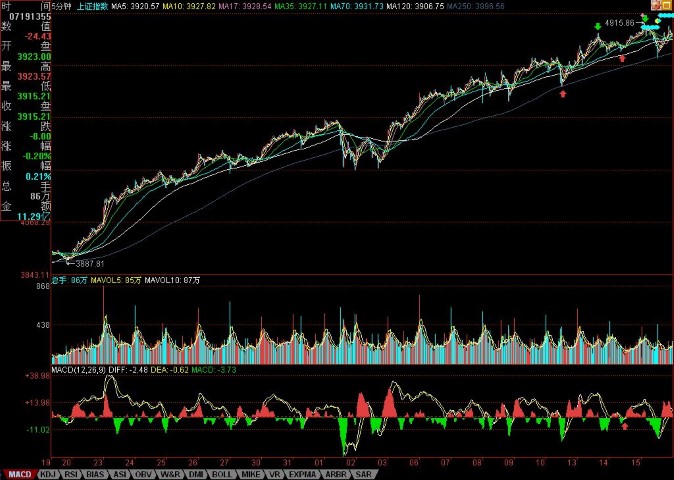 在今天的背驰判断中,关键是知道哪一段相比,显然,27-32 与 35-38 这两段去比。而实际的对比中,看 1 分钟图,去加两段对应的那些 MACD,太麻烦,所以可以看 5 分钟图。这里,把 5 分钟图给放上来了,图上,相应对比的两段已经标记出来,下面 MACD 的红箭头,对应是回抽那一下,对应走势,就是最后一个 1 分钟中枢形成的时候,前面两段的对比,极为教科书,请好好揣摩。