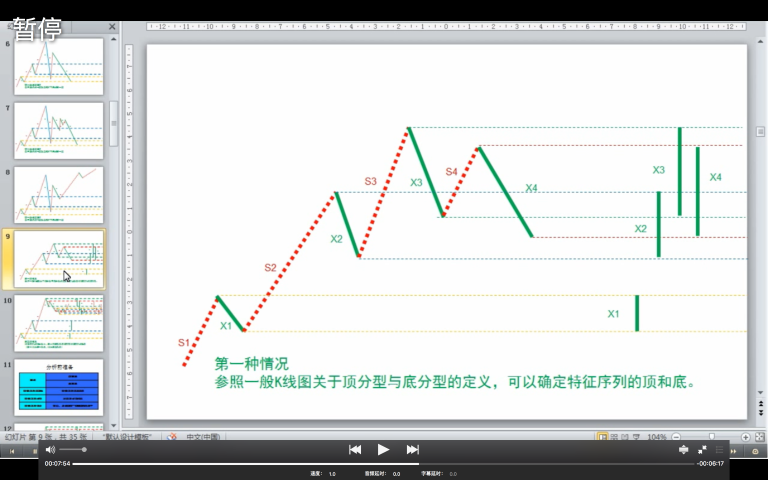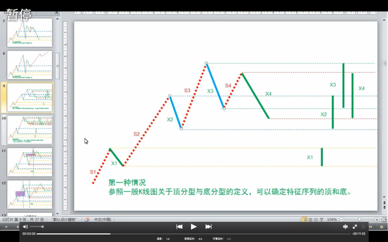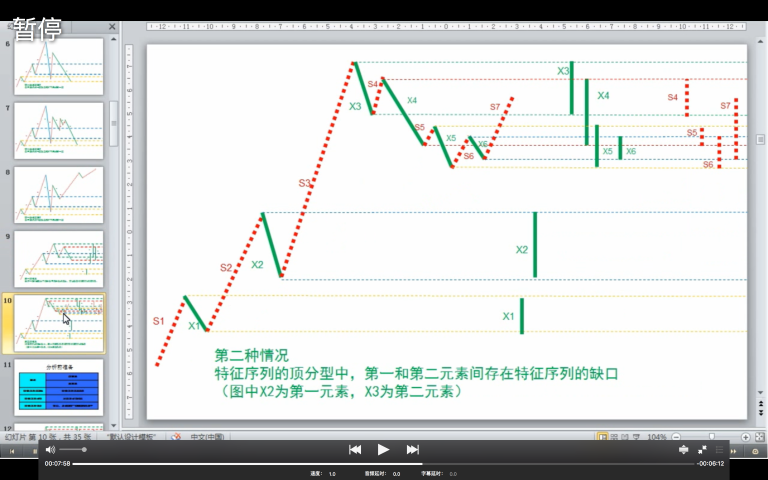 那么,为什么可以定义特征序列的分型呢? 因为在实际判断中,在前一段没有被笔破坏时,依然不能定义后特征序列的元素,这时候,当然可以存在前一特征序列的分型,这时候,由于还在同一特征序列中,因此,序列元素的包含关系是可以成立的;
