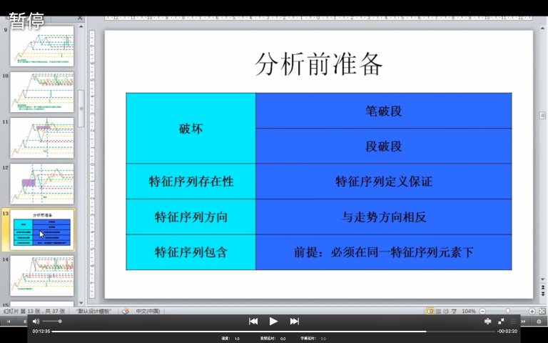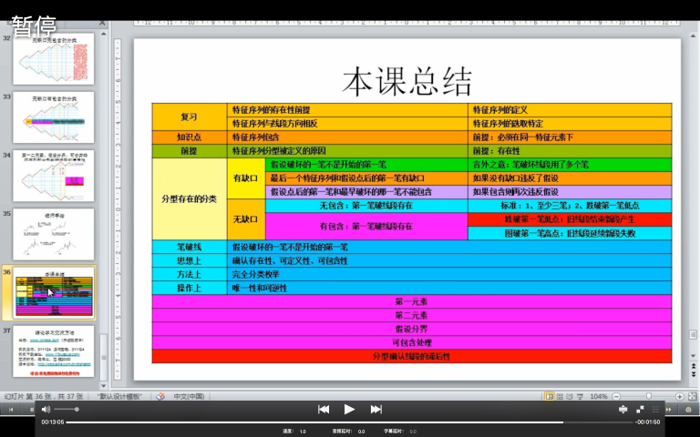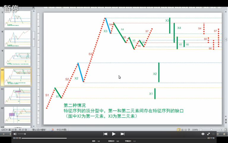 而 当前一段被笔破坏时,显然,最早破坏的一笔如果不是转折点开始的第一笔,那么,特征序列的分型结构也能成立,因为在这种情况下,转折点前的最后一个特征序列元素与转折点后第一个特征元素之间肯定有缺口,而且后者与最早破坏那笔肯定不是包含关系,否则该缺口就不可能被封闭,破坏那笔也就不可能破坏前一线段的走势。这里的逻辑关系很明确的,线段要被笔破坏,那么必须其最后一个特征序列的缺口被封闭,否则就不存在被笔破坏的情况。