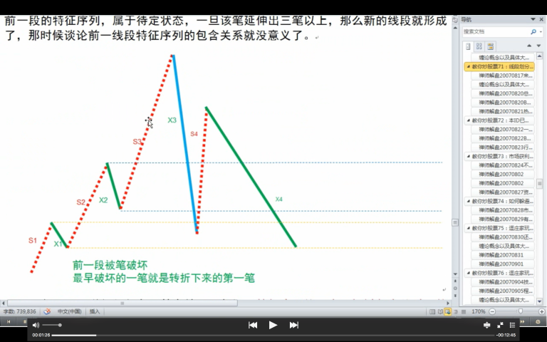那么,现在 只剩下最后一种情况,就是最早破坏那笔就是转折点下来的第一笔,这种情况下,这一笔,如果后面延伸出成为线段的走势,那么这一笔就属于中间地带,既不能说是前面一段的特征序列,更不能说是后一段的特征序列,在这里(种)情况下,即使出现似乎有特征序列的包含关系的走势,也不能算,因为,这一笔不是严格地属于前一段的特征序列,属于待定状态,一旦该笔延伸出三笔以上,那么新的线段就形成了,那时候谈论前一线段特征序列的包含关系就没意义了。