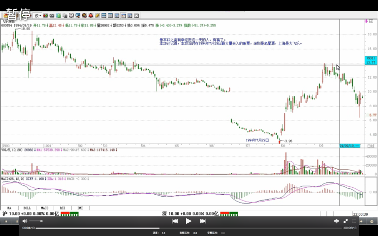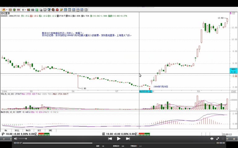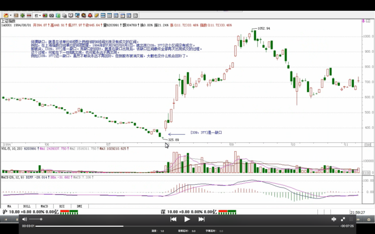 例如缺口,用向上的为例子。首先,要给缺口一个明确的定义,这定义是有利于分类的,只有明确的定义才有明确的完全分类。何谓 缺口,就是在该单位 K 线图上两相邻的 K 线间出现没有成交的区间。例如,在上海指数日线单位的 K 线图里,1994 年的 7 月 29 日与 8 月 1 日,就出现[339,377]这个区间没有成交。那就说,[339,377]是一缺口。而 缺口的回补,就是在缺口出现后,该缺口区间最终全部再次出现成交的过程。这个过程,可能在下一 K 线就出现,也可能永远不再出现。例如[339,377]这一缺口,虽然不敢说永远不再回补,但到股市被消灭前,大概也没什么机会回补了。像本 ID 之类有幸经历这一天的人,有福了。本 ID 还记得,本 ID 当时在 1994 年 7 月 29 日最大量买入的股票,深圳是老星源,上海是大飞乐。