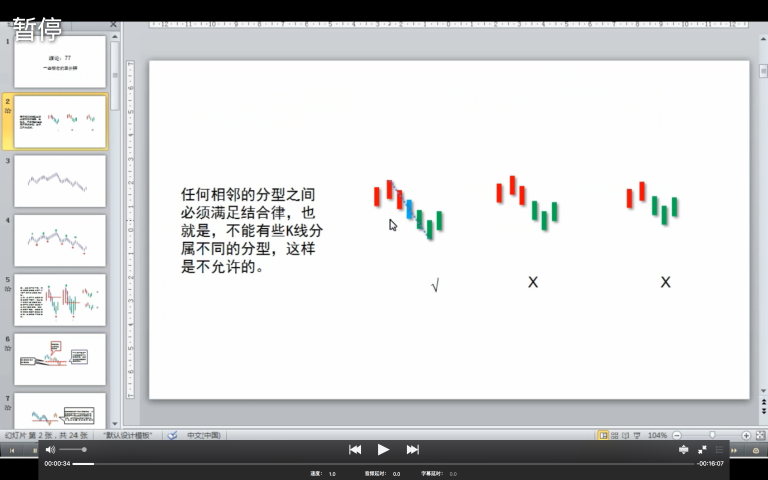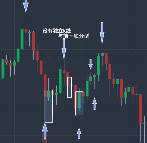 一、确定所有符合标准的分型。 (粗壮的种子:1.处理包含关系;2.处理结合律问题-处理 顶底分型共用 k 问题-根据具体情况取舍顶分型/底分型,如上图 3 中情况;3.找到底分型/顶分型,顶分型可以用向下的箭头、底分型可以用向上的箭头)