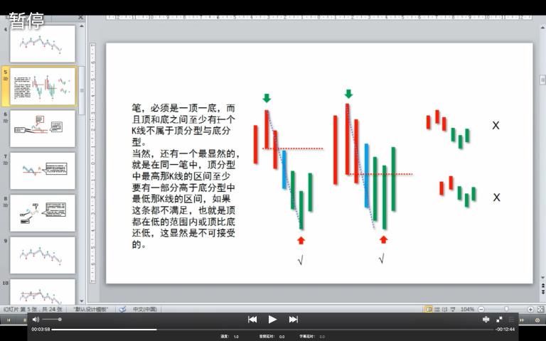 有了上面这基础工作,那这个图就可以看成只有这些分型,分型之间的 K 线都可以暂时不用管。下面的工作,就是确定笔了。笔,必须是一顶一底,而且顶和底之间至少有一个 K 线不属于顶分型与底分型。当然,还有一个最显然的,就是在同一笔中,顶分型中最高那 K 线的区间至少要有一部分高于底分型中最低那 K 线的区间(顶高点>底分型最低 k 线高点),如果这条都不满足,也就是顶都在低的范围内或顶比底还低,这显然是不可接受的。(粗壮的种子:笔的完整定义)